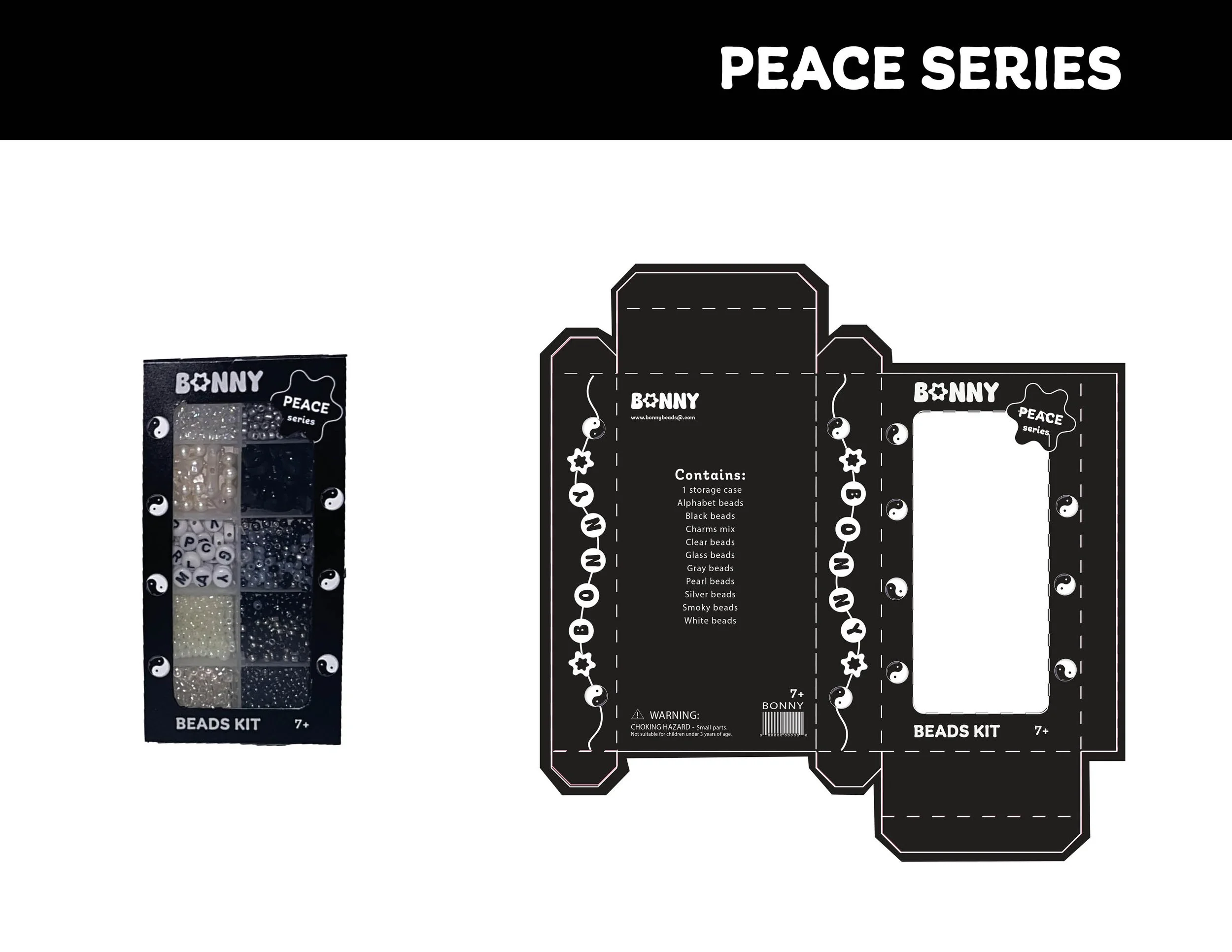 ● Peace: Features vibrant blues, yellows, and oranges, with smiley bead charm illustrations